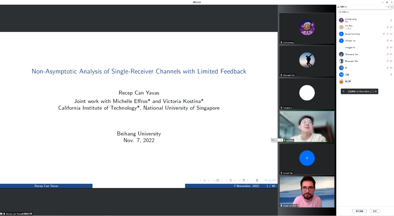2022年11月7日上午,新加坡国立大学的Recep Can Yavas博士受邀做线上学术报告,主题为“Non-asymptotic Analysis of Single-Receiver Channels with Limited Feedback”。本次报告由北京欧美大片ppt免费大全网络空间安全学院周琳老师主持,共有20余位师生在线参加。