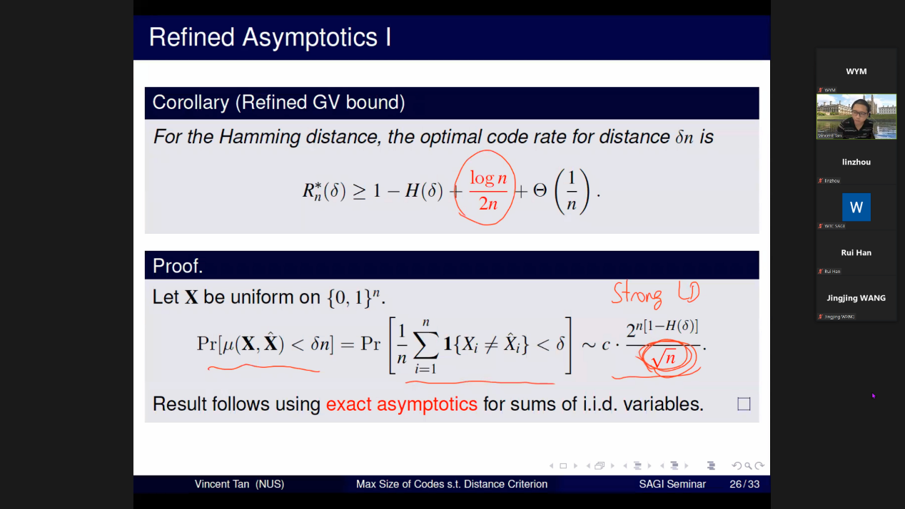In the report, Prof. Tan first introduced the block codes and the relationship between the distance criterion and the coding rate, and reviewed the classical Gilbert-Varshamov (GV) bound. Then, Prof. Tan carefully explained the method of constructing the optimal coding scheme under the arbitrary distance criterion, and explained the detailed process for the case of discrete and continuous sources. Prof. Tan further conducted a second-order and large deviation asymptotic analysis of the main results, and revealed the performance of the optimal coding scheme from different perspectives.